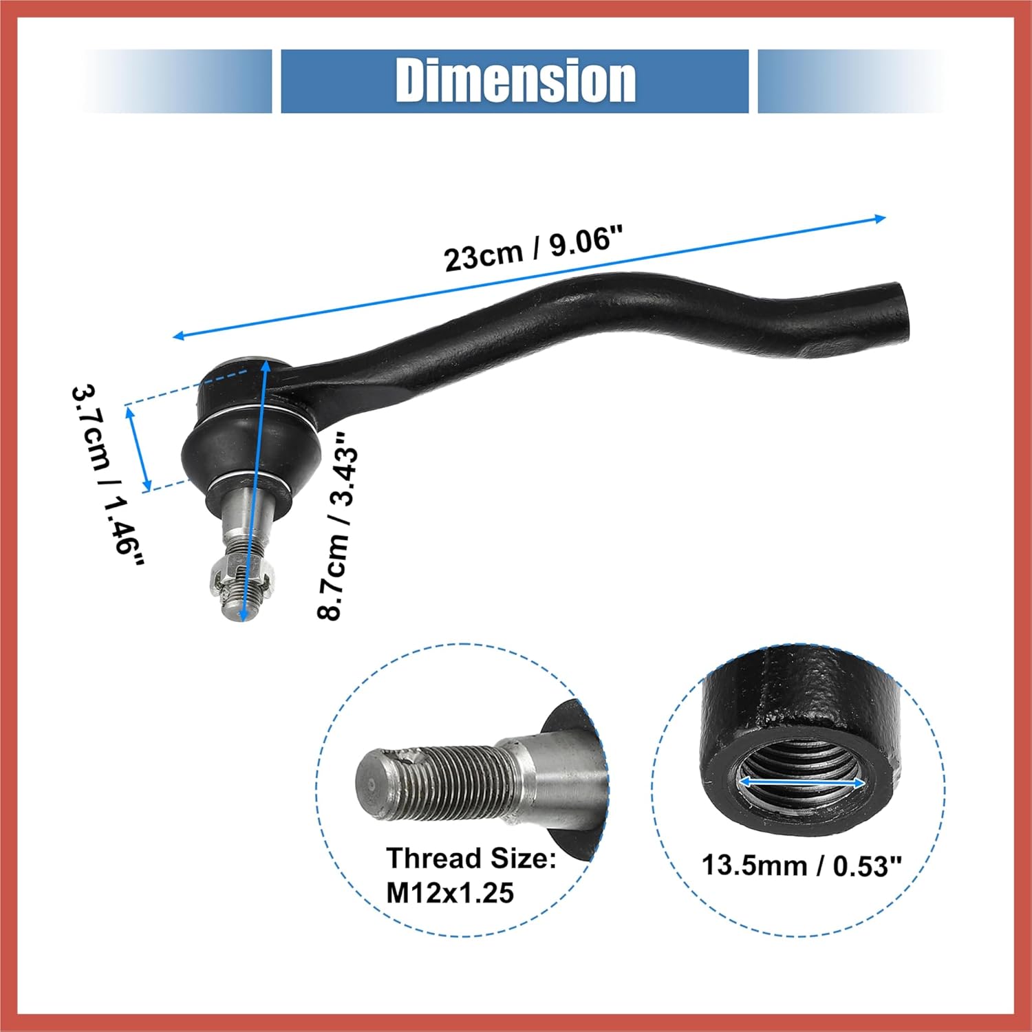 Features:Front inner and outer tie rod ends are made of good material for long-lasting dependability and durability under bad conditions. This resisted abrasion and environmental corrosion.Restores like new steering and handling.Durable surface treatment for anti-rust.This is a non-OEM product, accessory only!Specifications:Material: MetalColor: BlackOE Number: ES800357 (Driver Side) , ES800358 (Passenger Side)Other Part Number: D8640JA00A, D8520JA00APlacement On Vehicle: Front, Left, Right, OuterThread Size: M12x1.25Mounting Hole Diameter: 13.5mm / 0.53"Dimension: 23x8.7x3.7cm / 9.06"x3.43"x1.46"(L*W*H)Fitment: for Nissan Altima 2007-2015for Nissan Maxima 2009-2018for Nissan Murano 2009-2012Installation Steps: Loosen the pinch nut and remove the cotter pin.Remove the castle nut and the outer tie rod end.Remove the boot and the inner tie rod end.Replacing a new tie rod and installing it back according to the method of disassembly.Package Includes:2 x Front Outer Tie Rod End