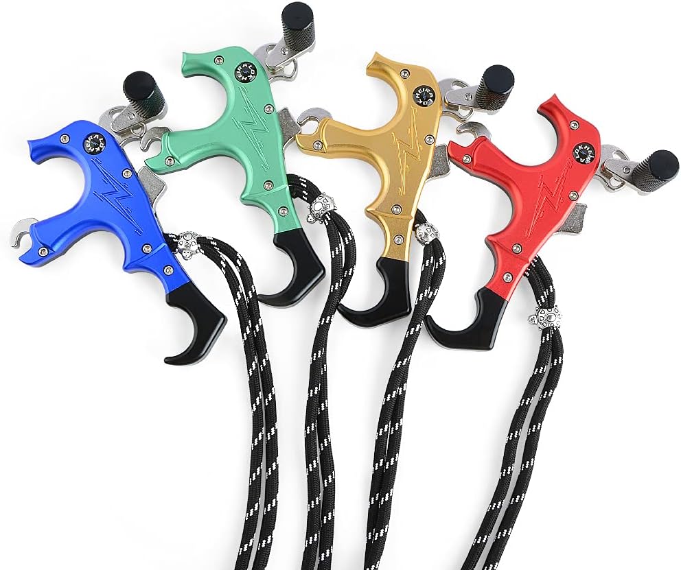 Item name: compound bow release Material: aluminum alloy Color: Blue, Red, Gold. Green Net Weight: 88g Package weight:116.8g Size: 10.5×5.5×3.2cm (four fingers), 9×5.5×3.2cm (three fingers) Packing size: 14.3×12.4×3.6cm Item name: metal d loop Material: aluminum alloy Color:lue, Red, Gold. Green Net weight:4.2g Size:2.2x1.8x0.5cm Package include: 1 x compound bow release aids 1 x d loop