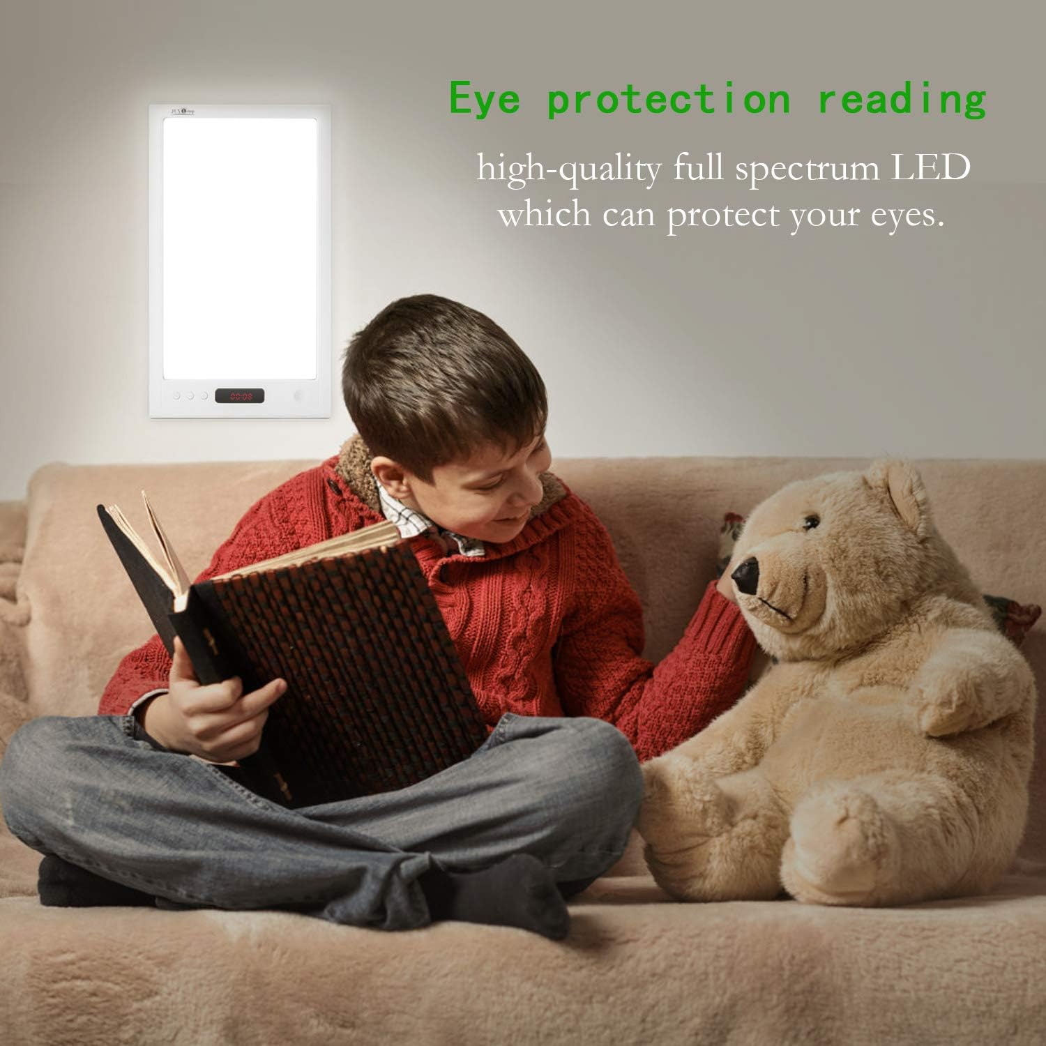 【Product Features】★---Modern people may be socially withdrawn, or due to poor climate, office/living environment is more closed and other factors make people can not get enough sunshine. This product adopts scientific optical design so that it can imitate the natural sunlight with high illumination and no UV rays. ★--You can program a preset time for the lights to automatically turn on/off (mimicking the sunrise/sunset process), thus effectively adjusting the body's biological clock pattern.★--This lamp provides up to 12,000 lux of intense light to provide you with your daily dose of sunshine. It can help with jet lag/shift work, and when you feel sleepy, sitting in front of this lamp can help you refocus and energize you!【Technical Parameters】☆--AC input: 100~240V 50/60Hz☆--DC input: 12V/1.5A☆--Illumination Intensity:0~12000Lux☆--Color Rendering Index: CRI>95☆--LED life circle: over 50000 hours (Brightness decrease less than 30%)【packing list】☆--1* Light Therapy Awakening Lamp unit☆--1* 18W AC to DC Adapter (Cable length 5 feet)☆--1* Product instructions