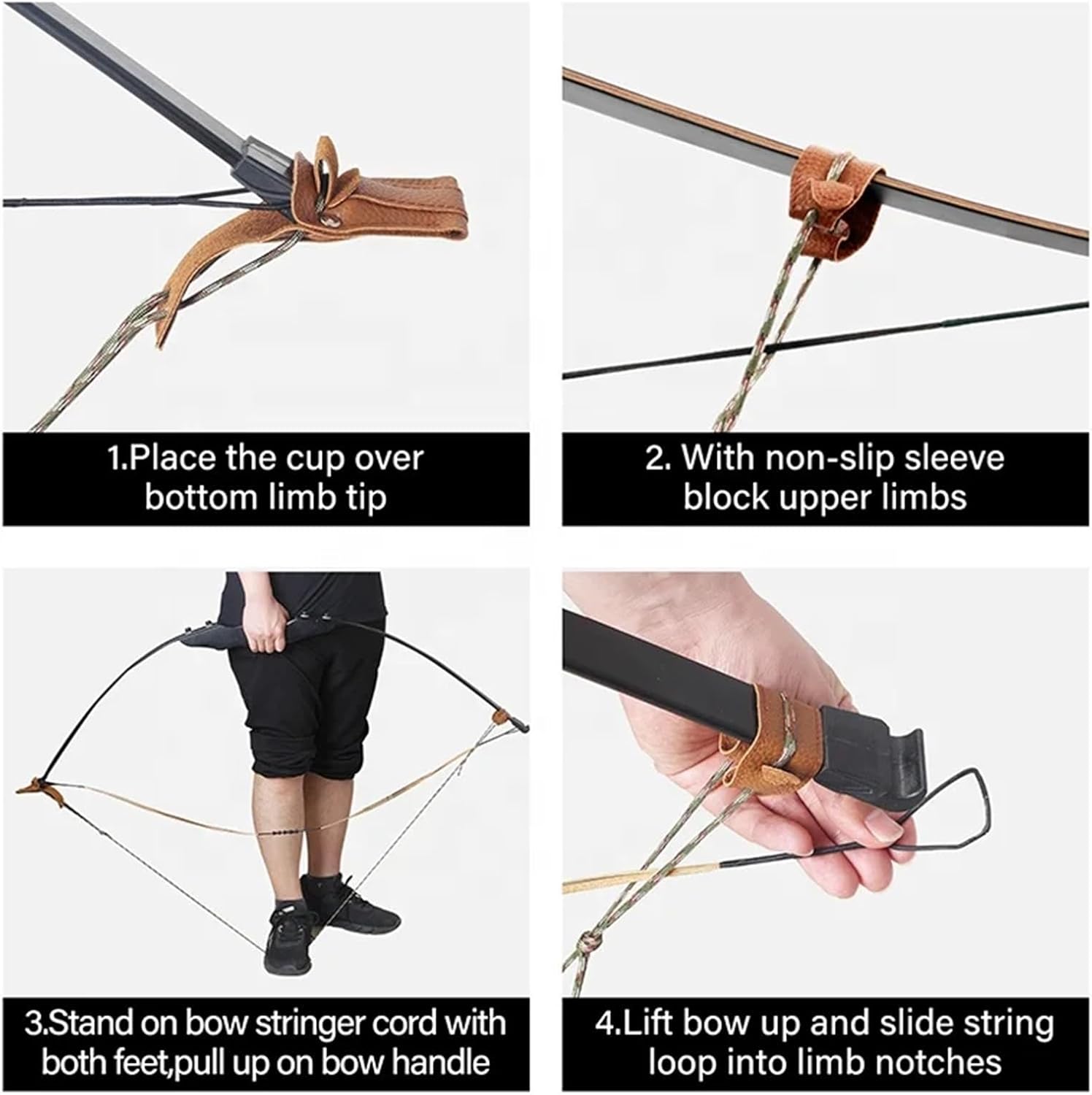 Products Description* ROTECT YOUR BOW: Our bow stringer uses high-quality leather, so it won't damage your recurve bow tip and limbs, the sturdy nylon rope guarantees durability* UICK INSTALLATION BOWSTRING: Lightweight design, very easy to use, you can quickly install and remove the bowstring* UITABLE FOR A VARIETY OF BOWS: Designed for recurve, traditional and longbows, the length of the nylon cord is adjustable so you can adjust the size according to the length of the bow* AFETY PROTECTION: Correct stringing can prolong the life of your bow, and use this tool to prevent damage or injury to you or your bow