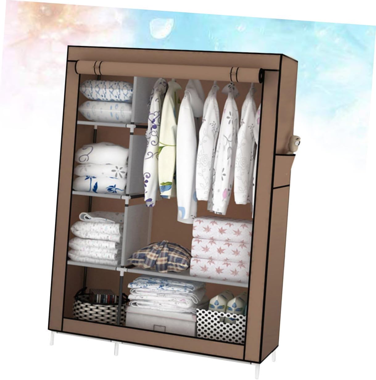 Package Include 1 x fabric closet storage Features - Color: Coffee fabric closet organizer. - Material: Fabric and metal fabric closet storage. - Size: 170 x 105 x 45 - Suitable for home/dormitory/rent house, etc portable closet for hanging clothes. - Sturdy, , dampproof, with portable wardrobe closet. - Combined with fabric cover, metal tubes and plastic joints, not difficult to assemble fabric closet with shelf. - Including haning space and shelves space with large capacity. - Movable and convenient.Goods Informationfabric closet storage Made of materials, sturdy, , dampproof, with .portable wardrobe closet It includes hanging space and shelves space to meet your needs with large capacity lot of clothes.fabric closet organizer This portable closet is movable, convenient for you to use.fabric closet with shelf Combined with fabric cover, metal tubes and plastic joints, not difficult to assemble.portable closet for hanging clothes Suitable for home/dormitory/rent house or anywhere you might need