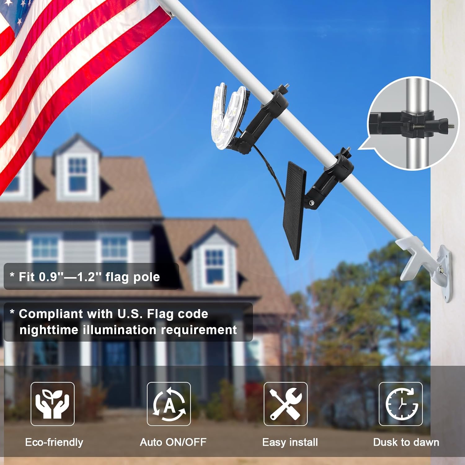 Illuminate your outdoor spaces with this versatile solar-powered flagpole light. Its 7.5" adjustable extension pole is perfect for 2-6" flagpoles, allowing you to proudly display your flag while providing ample lighting. But this multi-purpose lamp doesn't stop there - you can also use it as a garden light or for illuminating the eaves of your house at an angled position. With its sleek design and convenient solar power, this light offers a hassle-free solution for enhancing visibility and ambiance around your property. Enjoy the convenience of hands-free lighting without worrying about excessive energy consumption or tangled cords.