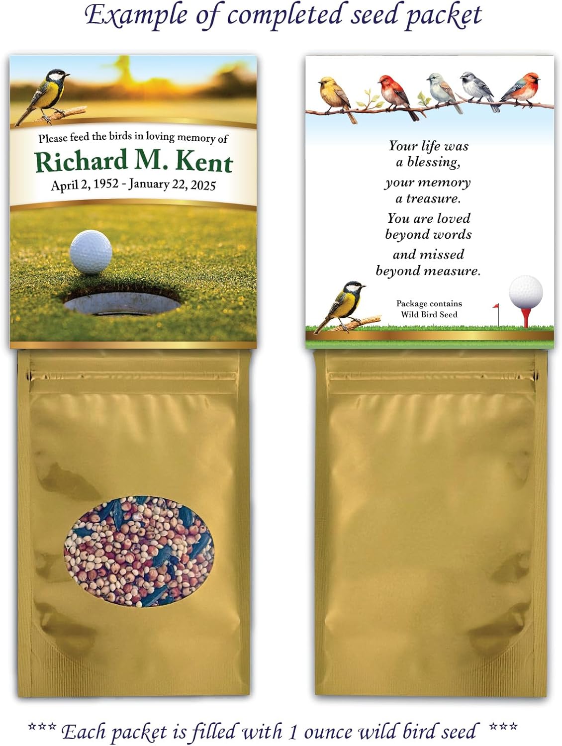 Personalized Memorial Funeral Bird Seed Packets Keepsake Tribute Favor. Golfer Golf Ball Course Design. Honor cherished memories with this thoughtful memorial bird seed keepsake. Personalized with Name of Loved One, Date of Birth and Date of Passing, and Custom Verse. This unique remembrance gift provides a special way to celebrate a life by nurturing nature, creating peaceful moments of reflection and connection. Perfect for memorial services, celebrations of life, or as a meaningful condolence gift that continues to provide comfort long after the service.