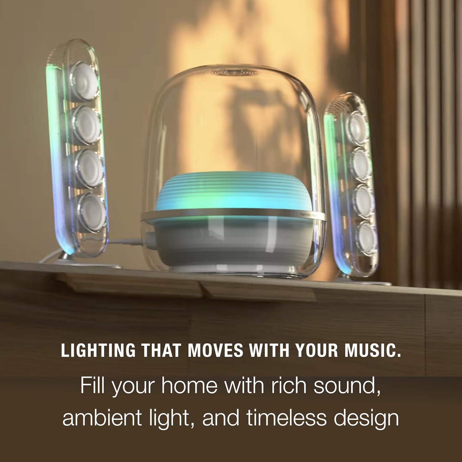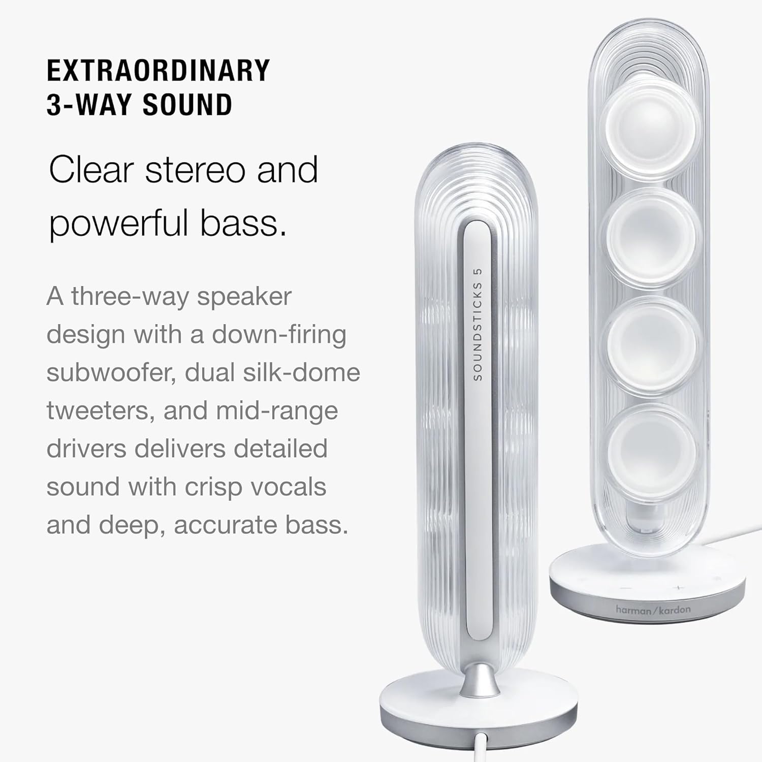 Imagine a relaxing dinner with friends, the music flowing as easily and seamlessly as the conversation. Or a cozy evening for two, with your most romantic playlist setting the mood while engaging lighting casts a soothing ambiance. With its iconic transparent dome and sleek, elegant curves, Harman Kardon SoundSticks 5 adds timeless style to any room. The satellite speakers and subwoofer create a captivating light show with rich colors and dynamic motion, transforming your listening experience with rich colors and fluid motion that match well with any mood. Beyond its classic design, SoundSticks 5 delivers truly exceptional 2.1-channel audio over Bluetooth®. Deep resonant bass, vibrant mids, and crystalline highs enhance your favorite music with unparalleled richness and detail, perfect for anything from a peaceful weekend morning to an impromptu evening house party. And using a simple one-cable HDMI ARC connection, you can elevate your TV, streaming, and gaming experience with detailed, dynamic sound. Experience the magic of Harman Kardon SoundSticks 5.