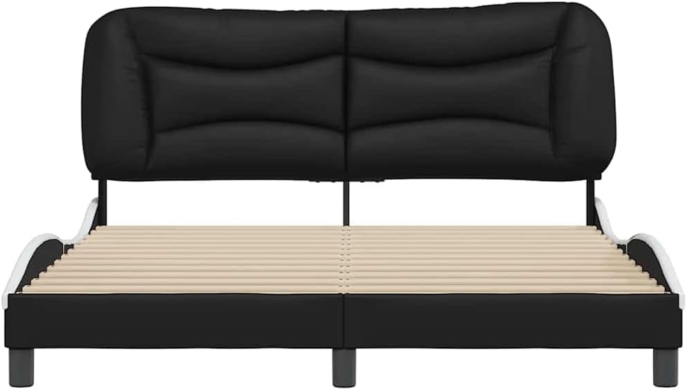 The Modern Bed Frame has a bold black and white design that fits right in with any modern bedroom. Its roomy dimensions and sleek look boost your sleeping space while offering comfort and style.Stylish Contemporary Look: The black and white color scheme looks great, making it a standout feature in your bedroom. It fits in easily with all sorts of decor styles.Headboard Cushion: Enjoy extra comfort leaning against the snazzy headboard cushion, made from soft faux leather—great for reading or just chilling in bed.Durable Construction: Built from solid pine wood and plywood, this bed frame is designed to be strong and last, so you can rest easy without worrying about it falling apart.Generous Sleeping Surface: With a width of 61.8 in and length of 85.8 in, the bed frame gives plenty of space for two adults to sleep comfortably while still looking elegant.Easy Maintenance: The stain-resistant surface is simple to clean, meaning you can keep it looking fresh with minimal hassle—perfect for everyday use.Color: Black Shape: RectangularMaterial: Faux Artificial LeatherFinish: Matte Indoor/Outdoor: Indoor OnlyCover Included: NoRoom: BedroomMaximum Number of People: 2Dimensions: 61.8 x 85.8 x 29.3 in (W x L x H)Swings: NoDelivery Contains: 1 x Bed frame with headboardAssembly Required: YesRecommended Number of People for Assembly: 2