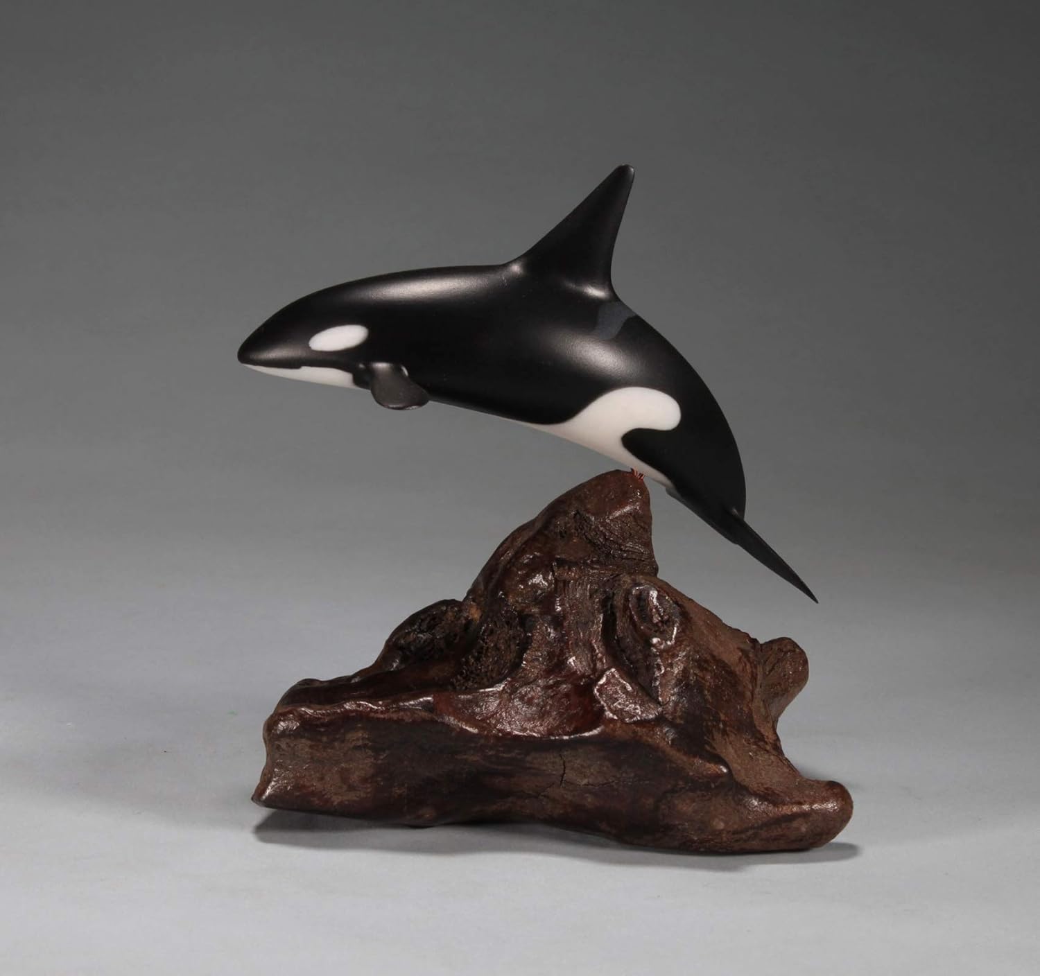 The Orca is about 6 inches long. Mounted on a polished burlwood base, the piece stands about 5 inches tall and 6 inches long. This is the downtail version. We also have a slightly different Uptail version PLEASE NOTE: these photos are of illustrative samples. Each burl is a unique piece of nature's art, so the one you will receive will be different but of similar size and equal beauty. The Orca is molded from Pellucida, a proprietary compound of resins that resembles Bisque porcelain, but is more durable. It is SIGNED and comes with a CERTIFICATE OF AUTHENTICITY.