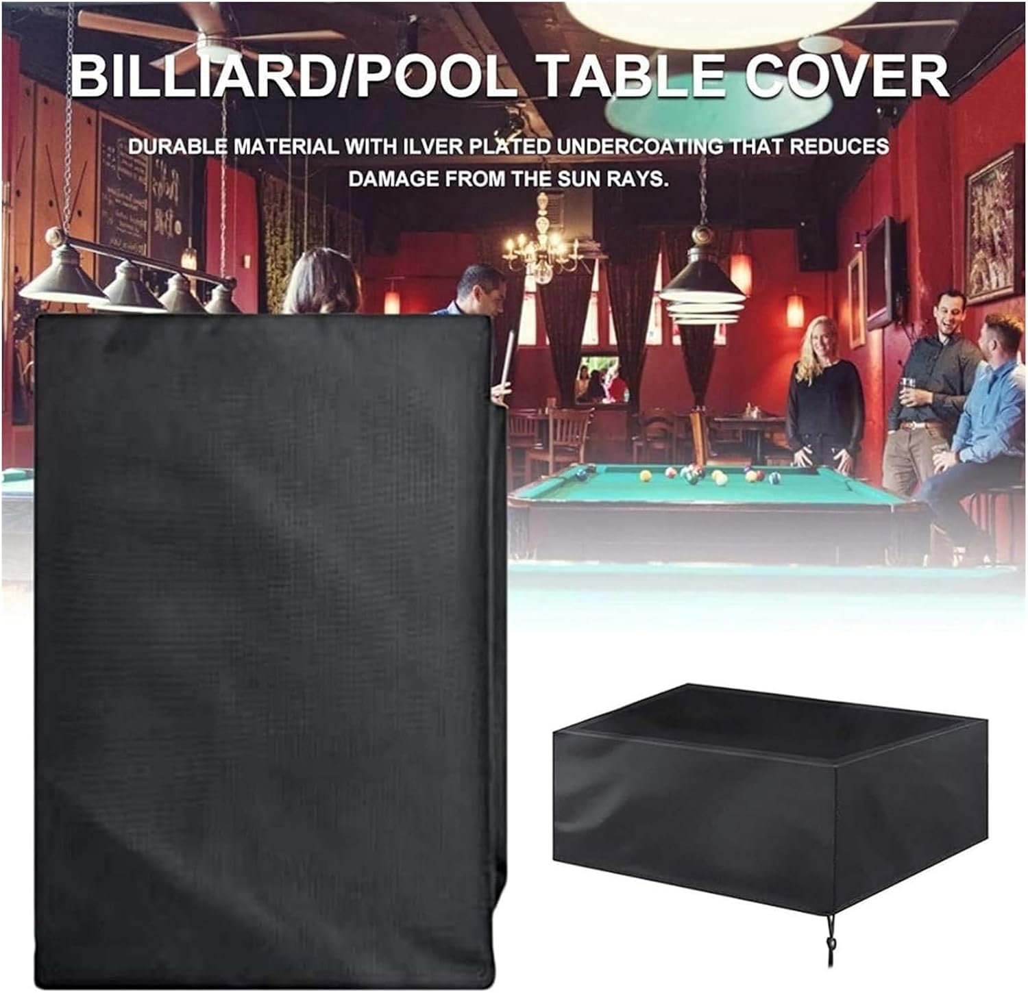 This cover shields your table from dust, scratches, and spills when not in use. Its durable construction ensures long-lasting performance, while the tailored fit provides a snug and secure coverage. Maintain the sleek appearance and prolong the lifespan of your beloved pool table with this essential accessoryMaterial: Oxford Colour: Black Dimensions (Length * Width * Height):# 7Ft: 7.4x3.8x2.7 ft / 89x46x32in / 225x116x82cm # 8Ft: 8.5x4.2x2.7 ft / 102x53x32in / 260x135x82cm # 9Ft: 9.4x5.1x2.7 ft / 113x61x32 in / 287x155x82cmPACKAGE 1 x Pool Table Cover, 1 x Storage Bag