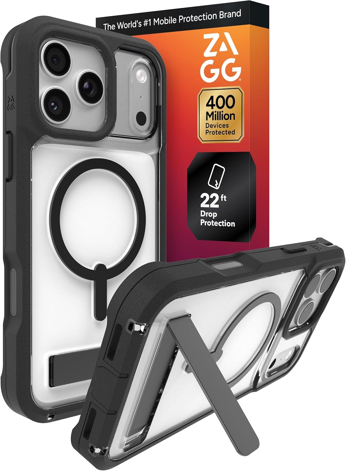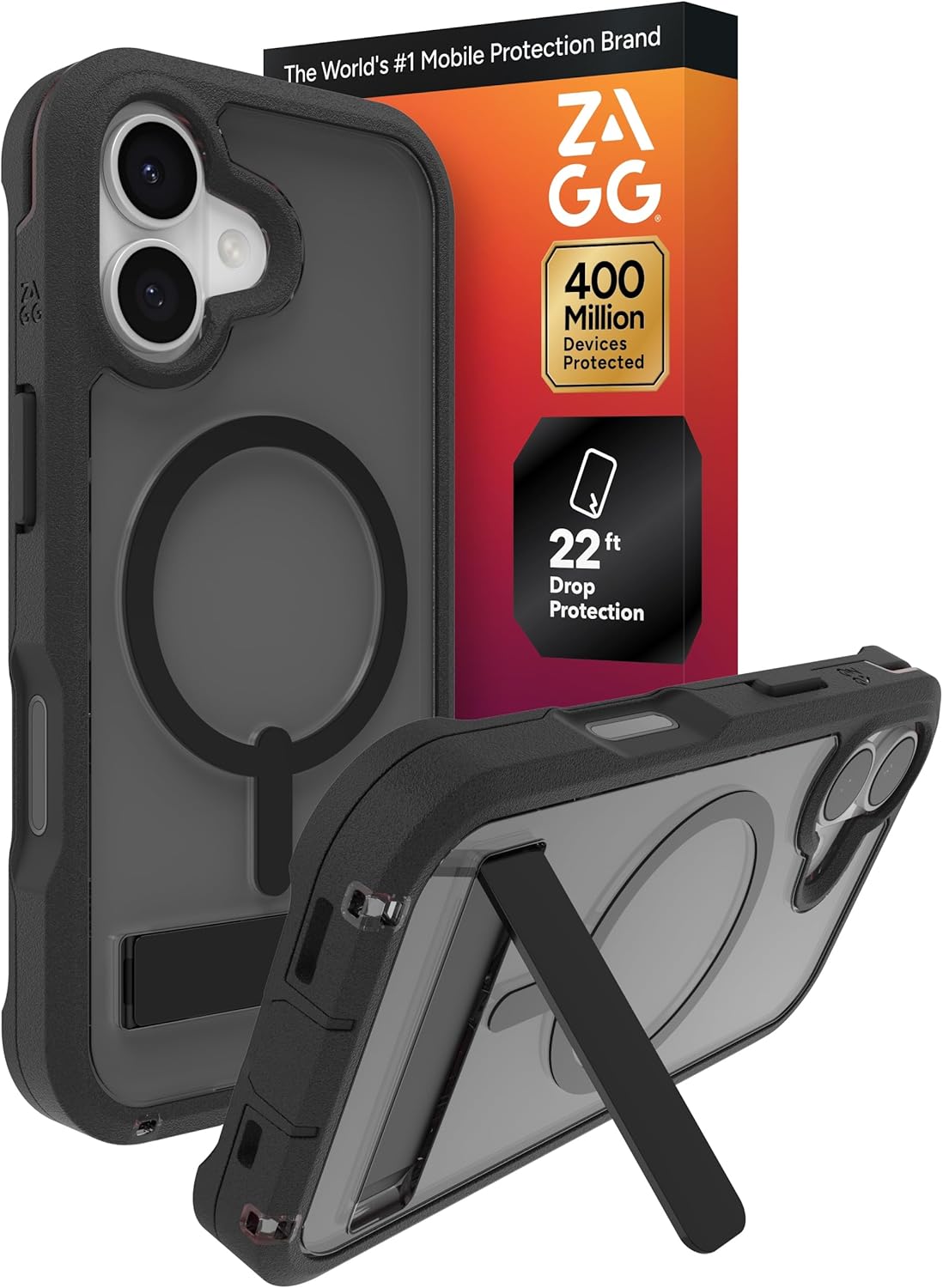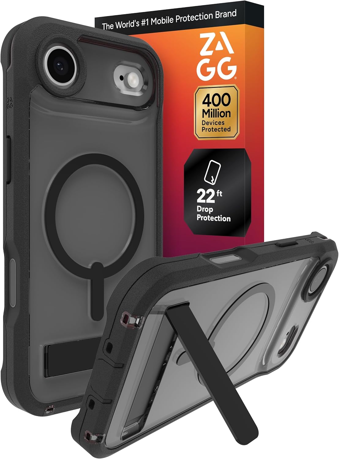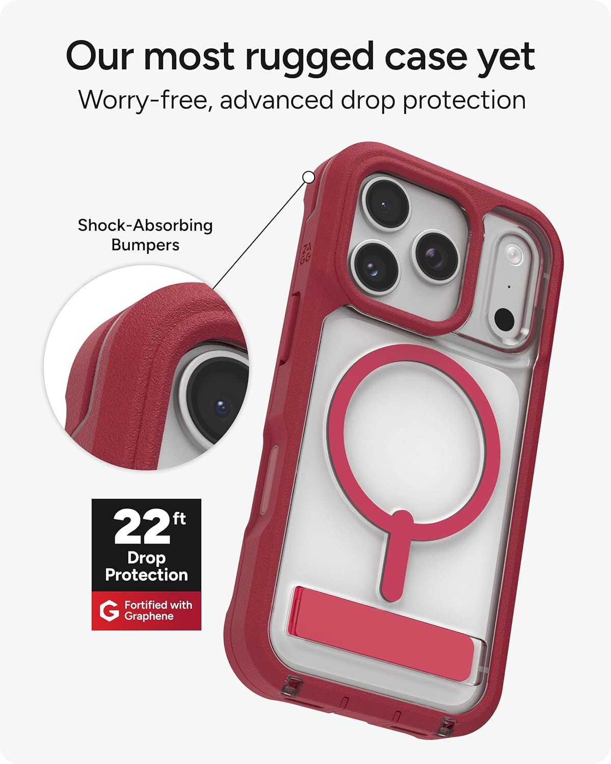 Extreme Protection for Your iPhone Get maximum defense with the ZAGG Rainier Phone Case for iPhone, a rugged yet sleek MagSafe-compatible case designed for extreme impact protection. Made with Graphene, harder than a diamond, more elastic than rubber, and up to 200x stronger than steel, Magnetic Rainier shields your device from drops up to 22 feet (7m)*, with reinforced corner bumpers and a durable two-piece snap-on frame. The built-in kickstand holds your phone securely in portrait or landscape mode for hands-free video calls, streaming, cooking, and more, folding back flush when not in use. Magnetic compatibility means Rainier works with most wireless chargers and magnetic accessories like wallets and ring grips, so you can power up or accessorize without removing the case. Designed for both style and utility, Rainier’s compact profile fits comfortably in your hand or pocket, with optional lanyard attach points to keep your phone close at hand. Crafted with up to 84% recycled materials**, it combines high-performance protection with thoughtful design, ready for anything your day brings. *Mil Std 810G 516 **Recycled material content is verified by an independent third party.